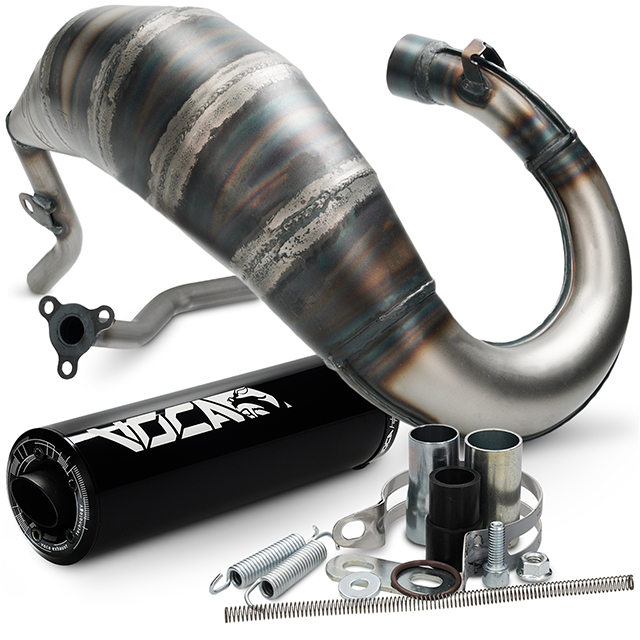 Exhaust system VOCA Cross Rookie 50 / 70cc for Sherco 50 SM-R / SE-R models. With European CE e-aproval! VOCA Racing now offers this handwelded upper exhaust equipped with reinforced aluminum silencer and laser engraved logo. Exclusive racing look designed for the most demanding, to be combined with a 50cc or 70cc mid-range preparation. The VOCA Cross Rookie 50/70cc (CE) exhaust is available in two versions, with red or black muffler. Note – For the new Beta 50cc gearbikes there are very few exhausts available in the market. Without a doubt the Cross Rookie 50/70 is one of the best options. Red silencer.