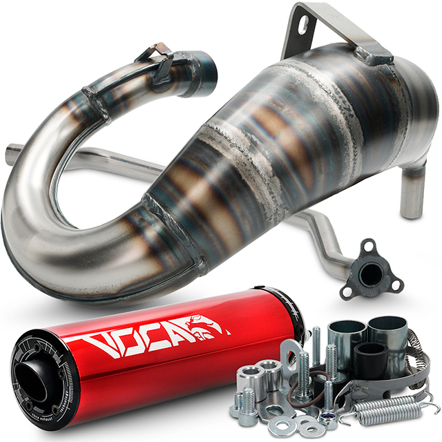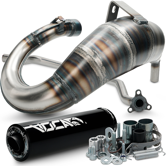New homologated VOCA upper exhaust for all supermotard and motocross fans. The new VOCA Cross Rookie exhaust is homologated and consist of a handwelded body assuring the typical VOCA Racing look. Equipped qith high quality VOCA alloy silencer. The perfect exhaust for 50cc to 70cc Sport cylinders. Fits on Yamaha DT50 and MH RYZ 50 models. Black silencer. Check your favourite VOCA dealer!