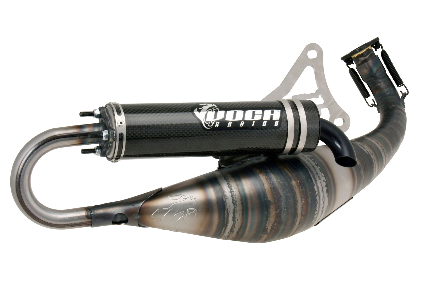 Welded with 16 cones with 0.8 mm sheet metal, with the VOCA logo embedded in the last cone. To absorb the vibrations of a competition engine, the Combat 70cc exhaust has two silent blocks instead of one.