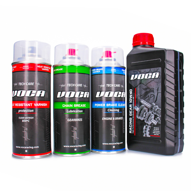 Maintenance kit 4 in 1 VOCA Tech-Care for gearbikes, includes Chain-Grease, Power-Brake Cleaner, heat resistant Varnish and synthetic Transmission oil 10W40. Clean, Protect, Lubricate – get your special price VOCA Tech-Care kit including all needed maintenance products. Clean engine-, metal- and brake parts with the highly efective VOCA Power Brake Cleaner. Clean and Lubricate your bike chain with the high quality and sticky VOCA Chain Grease. Protect your racing exhaust with the VOCA 800º C Heat Resistant Clear Varnish. Use the high performance synthetic VOCA 10W40 transmission oil to assure smooth and precise gear shifting. RSP 29 € (18% Saving RSP buying separately: 35,50 €).