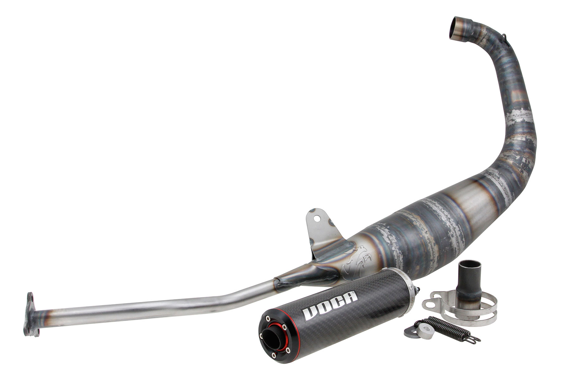 Le corps de cet échappement, avec une forme unique novatrice le démarquant, est fait de 16 pièces en acier tôle xc de 0,7 mm d’épaisseur dans lequel vous trouverez le logo VOCA emboutit.
