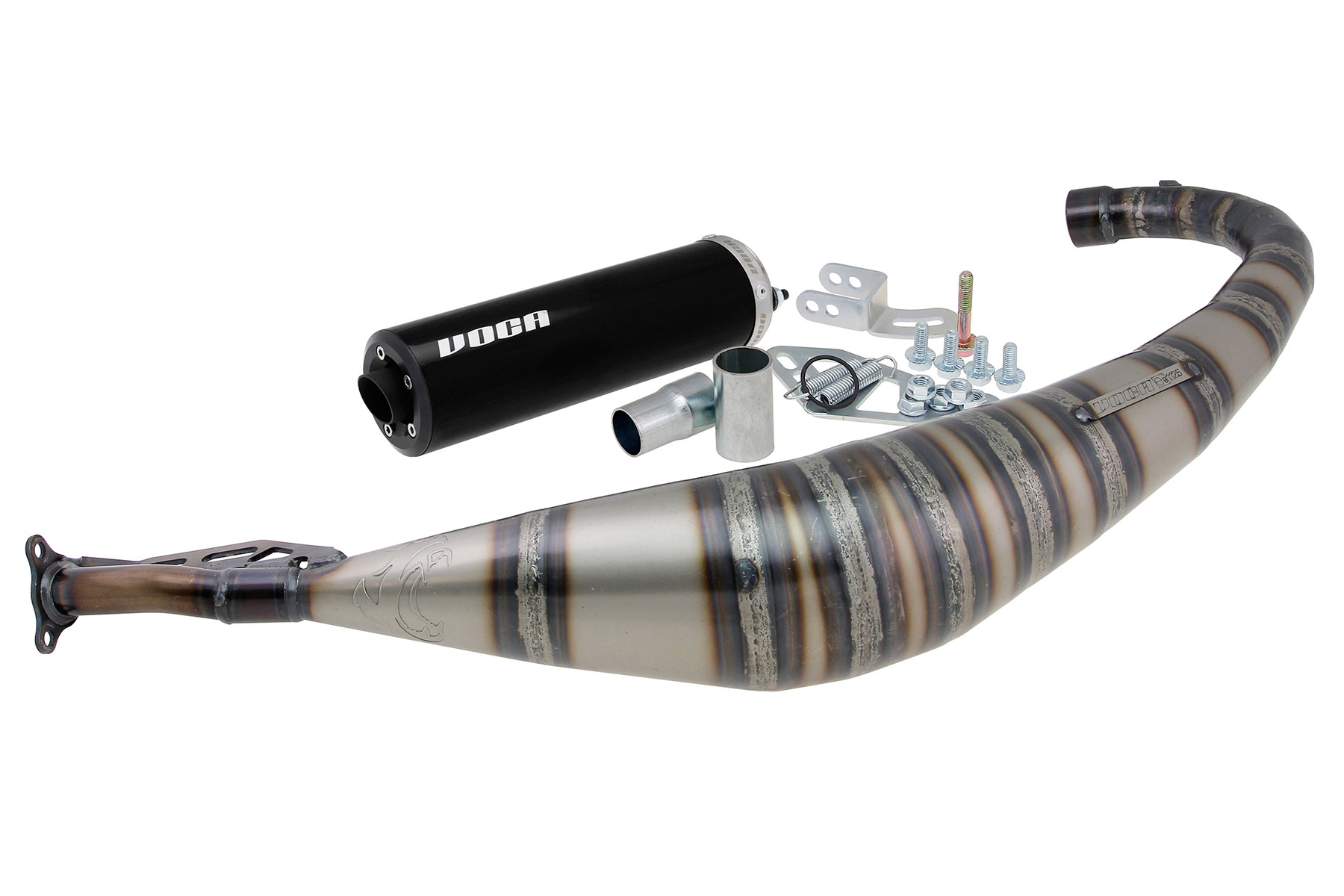 VOCA Racing lanza un escape de 50cc homologado en toda la unión Europea! Un escape con los acabados muy cuidados en todos los aspectos. La bufanda esta soldada a mano cono a cono, un detalle que le da un look 100% Racing. Por otro lado destaca el silenciador fabricado en aluminio y con el logotipo Voca grabado en láser y como en el resto de versiones, reforzado con una brida adicional. Un escape pensado para los más exigentes, ya que se puede combinar con una preparación básica y retirando el limitador con una preparación de gama media. El escape esta disponible para Minarelli AM6 y Derbi, con el silenciador en rojo y en negro. Entra en Youtube y encuentra el video oficial de este producto: http://www.youtube.com/user/VOCARacing