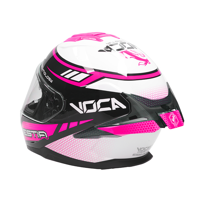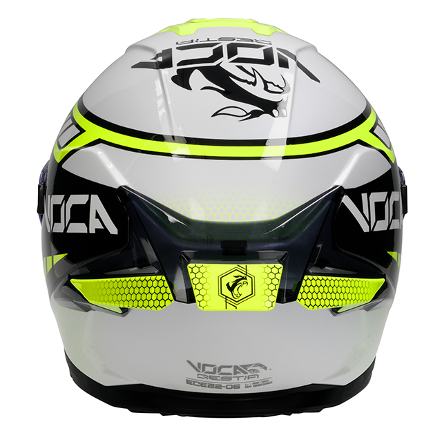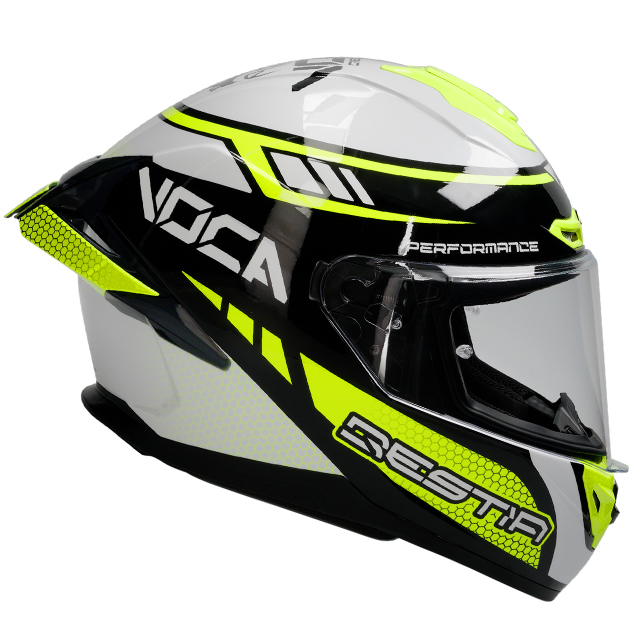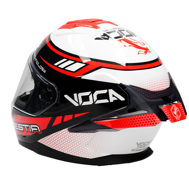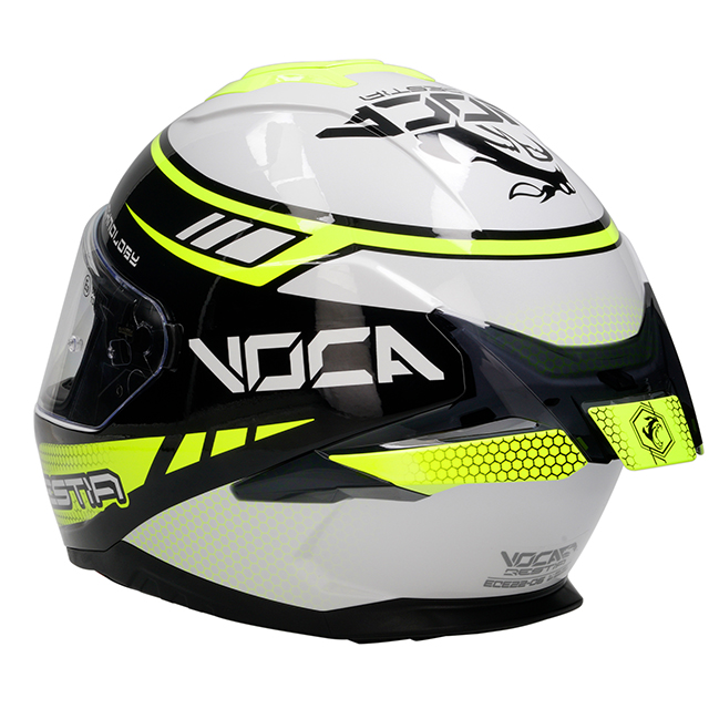 We highlight the ABS shell for exceptional protection, the dark smoked spoiler with the final sliding vent opening with the Voca logo, the multiple coloured honeycomb details leading to a visual fluidity in line with our racing style.