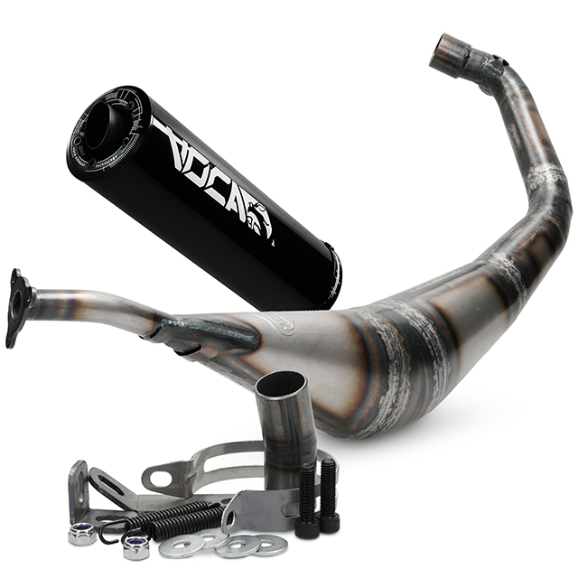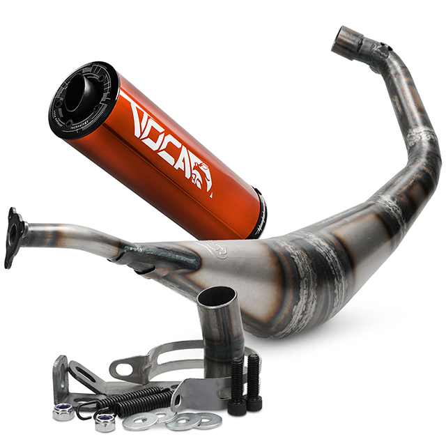 Hand-welded VOCA Warrior 50/70 exhaust for original 50cc cylinders and 70cc Sport type cylinders. A high performing exhaust-system, hand-welded out of 10 cones, equipped with a high quality VOCA silencer.
