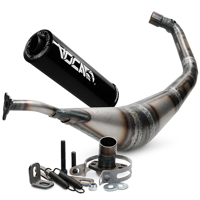 Hand-welded VOCA Warrior 50/70cc exhaust system developed for motorcycles equipped with original 50cc or 70cc Sport cylinders.