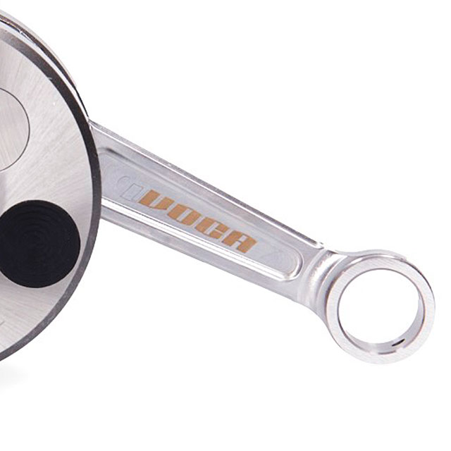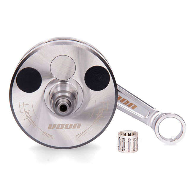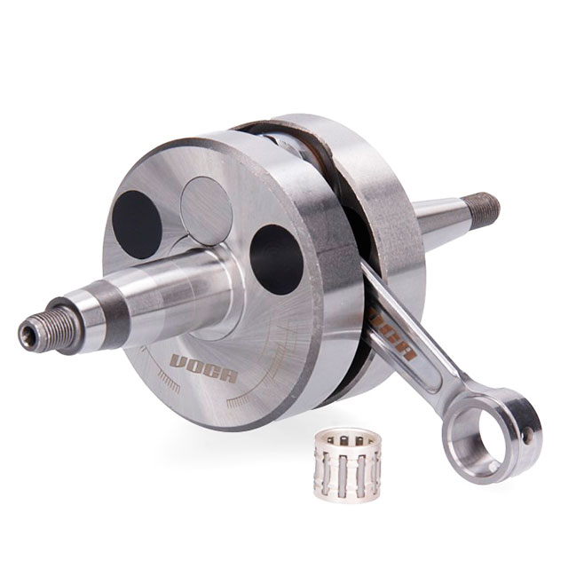 New reenforced high quality VOCA crankshafts for tuned gearbikes. Elaborated of high quality materials only, completed with black anodized aluminium inserts which lower the weight of the crankshaft and increase the performance of the engine. VOCA crankshafts are made to resist and to enhance the performance of most powerful cylinders. Equiped with CNC machined conecting rod and silver needle bearing. Standard measures, validated up to 16.000 RPM. Available for Derbi Euro2, Derbi Euro 3 and Minarelli AM6 engines.