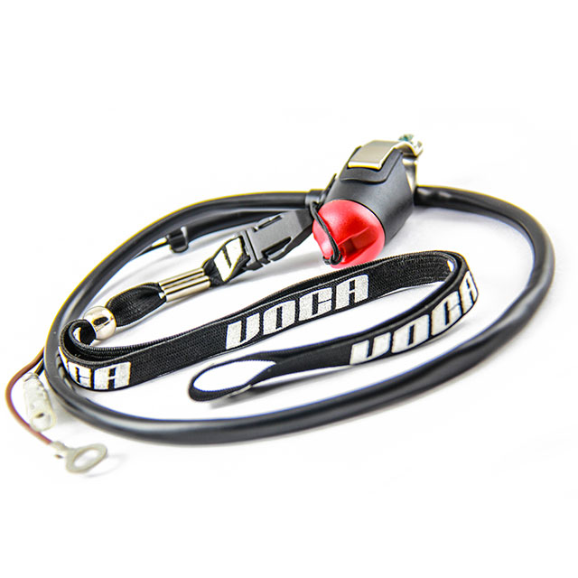 The VOCA killswitch is a very useful accesory for competition and daily use. The VOCA Killswitch consists of a fix and a detachable part. The fix part has to be fitted to the handlebar. The detachable part consists of a flexible lanyard with an magnetic ending that has to go around the drivers wrist. In case that the magnetic end of the lanyard is connected to the base of the killwitch the bike is ready to go. But once the lanyard is deconnected the iginition is interrupted and the bike will stop.